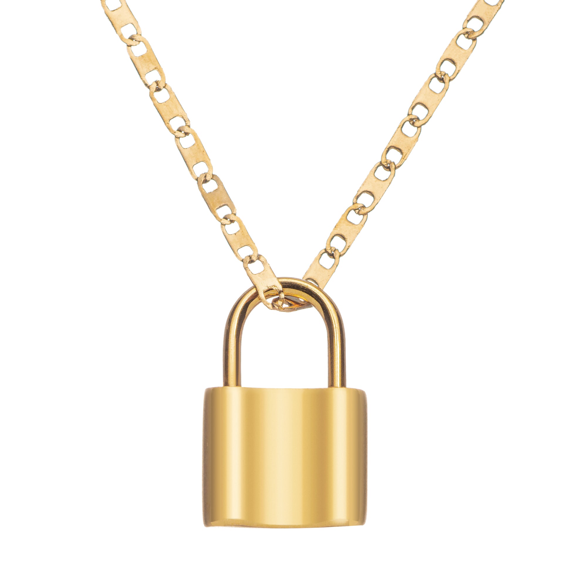 This sleek gold lock necklace is crafted from durable 304 stainless steel and finished in radiant 18K gold vacuum plating. With its high-polish surface and soft design, it is lightweight, water-resistant, and designed to layer or stand alone.